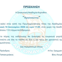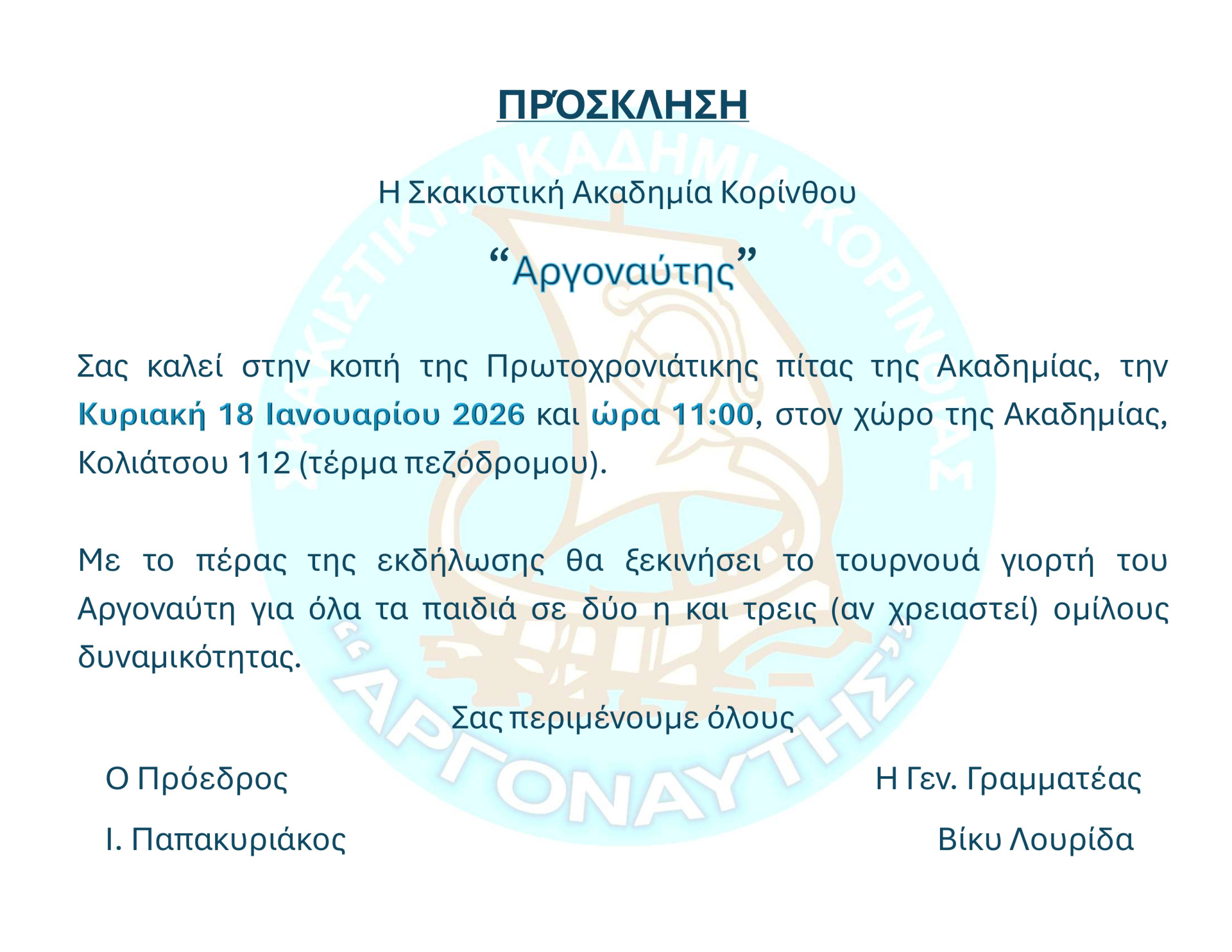 Σας καλούμε στην κοπή της Πρωτοχρονιάτικης πίτας της Ακαδημίας, την Κυριακή 18 Ιανουαρίου 2026 και ώρα 11:00, στον χώρο της Ακαδημίας, Κολιάτσου 112 (τέρμα πεζόδρομου).