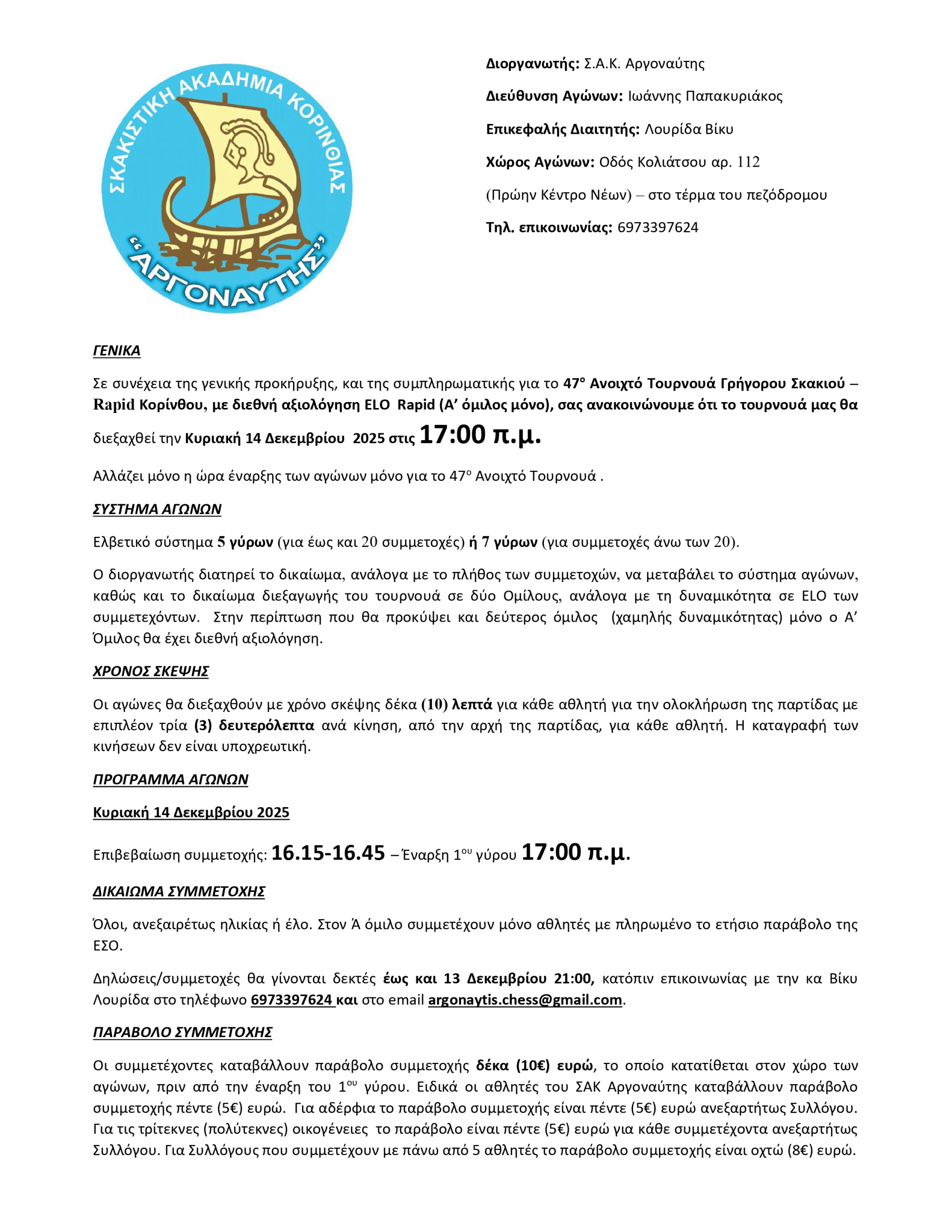 Αυτην την Κυριακή, 14 Δεκεμβρίου 2025 σας καλούμε για ένα ακόμα Rapid Tουρνουά στον Αργοναύτη.